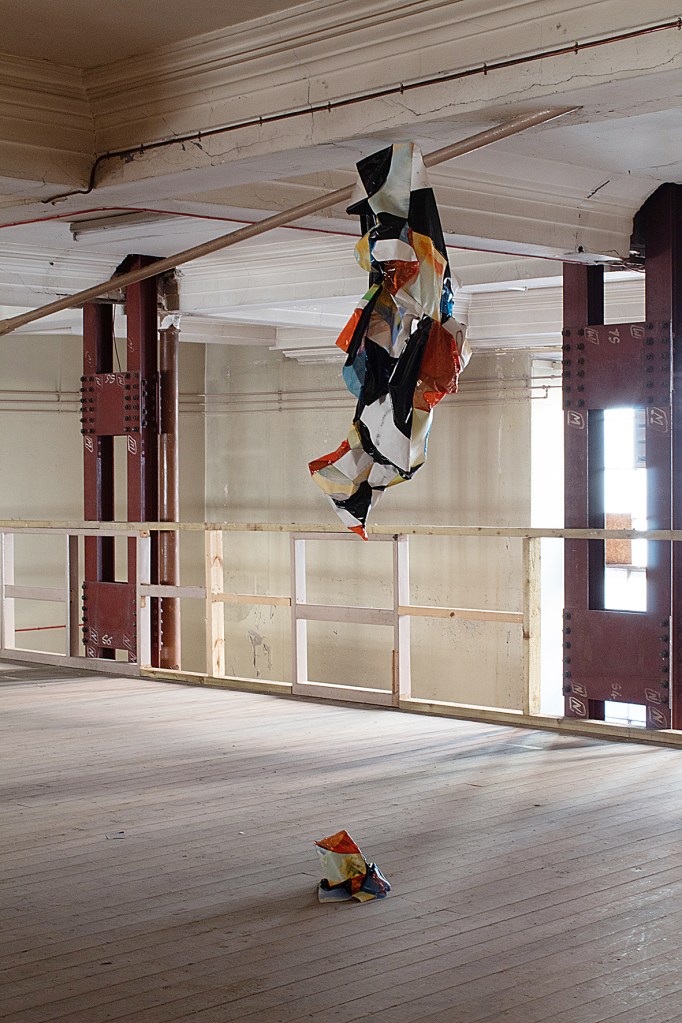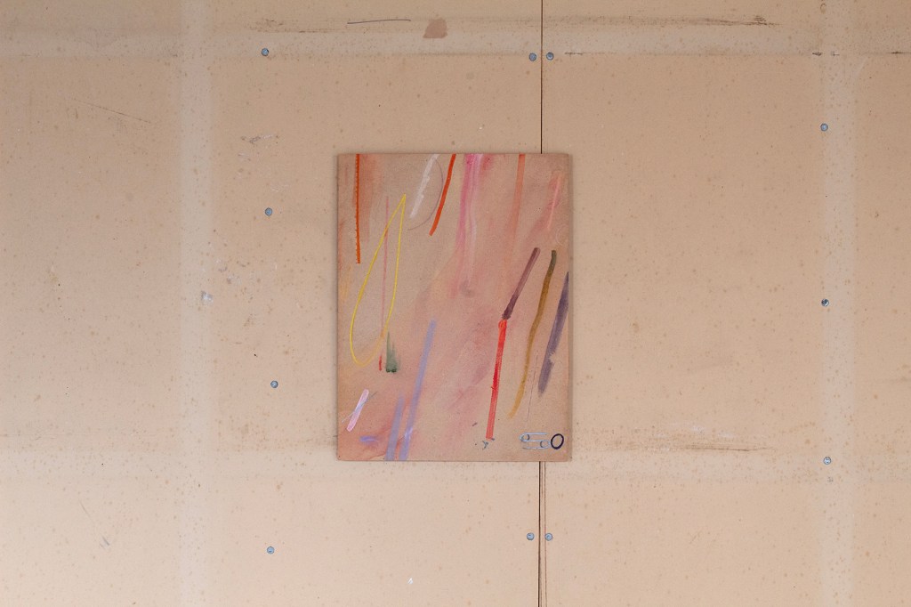 Strewn across the exhibition space (that used to be a former performance hall), each work inhabits a surface of its own, whether wooden floorboards, whitewashed walls or glass-block windows. Instead of only being hung on walls side by side, each artwork is playfully arranged within the space (with Michaela Zimmer’s ‘PARTs 240702’ quite literally hovering above the ground) and interacts with their surroundings in its own manner; neither is superior or inferior to the other. The austere interior only highlights the warmth of the pieces that collectively brim with vitality and colour, glowing throughout the industrial setting, however, stand out as separate islets. Roberts has deliberately selected natural lighting as the sole source of illumination for the exhibition, as it ‘brings forth an interesting solution to the display of artworks. This light, as it changes throughout the day, translates onto the colour palette of each artwork – during different times of day, each hue transforms, thus rendering the experience of attending the exhibition more thrilling.